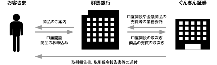 ぐんぎん証券では、群馬銀行と金融商品仲介業務に関して委託契約を締結しています。群馬銀行がぐんぎん証券からの委託を受けて、証券取引口座の開設手続きや、外国債券の売買等のご注文をお受けしますが、お客さまのお取引の相手方はぐんぎん証券となります。