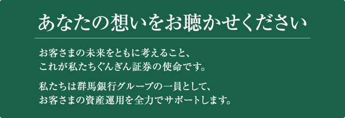 群馬銀行グループの証券会社として銀行と連携し、お客さまの資産形成をお手伝い