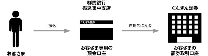 お客さまの証券取引口座へのご入金は、群馬銀行振込集中支店へお客さまごとに設けられた専用口座へお振込みいただくことでお手続きができます。専用口座番号は口座開設完了の際にご郵送させていただく「証券取引口座開設手続き完了のご案内」に記載しております。