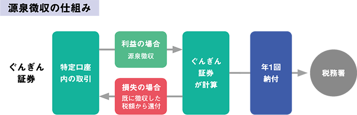 取引の都度、ぐんぎん証券が利益から税金を徴収し、年間の税額をまとめて税務署に納付します。利益であれば所得税と住民税が徴収され、損失であれば徴収した税額から還付されます。